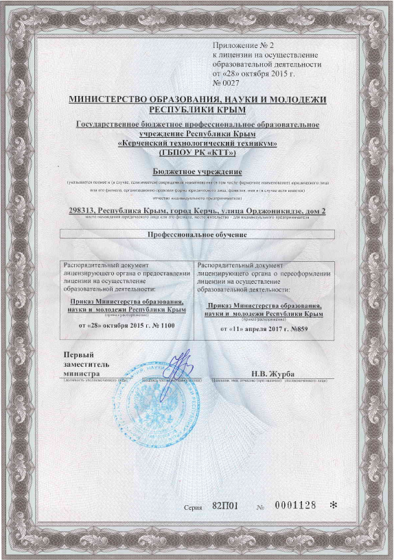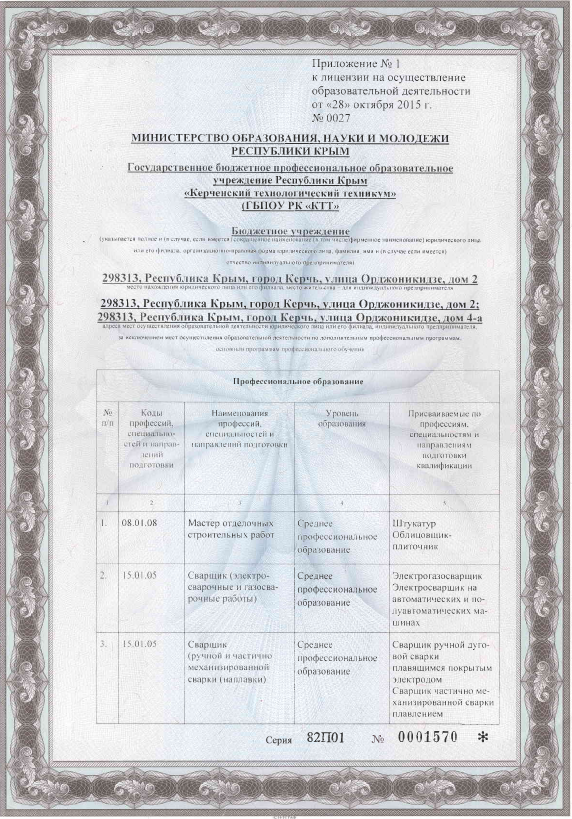 - Места осуществления образовательной деятельности по основным программам профессионального обучения: ГБПОУ РК «Керченский технологический техникум», 298313, Российская Федерация, Республика Крым, город Керчь, улица Орджоникидзе, дом 2, город Керчь, улица Орджоникидзе, дом 4-а