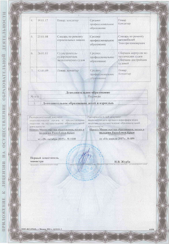 - Места осуществления образовательной деятельности по дополнительным образовательным программам: ГБПОУ РК «Керченский технологический техникум», 298313, Российская Федерация, Республика Крым, город Керчь, улица Орджоникидзе, дом 2, город Керчь, улица Орджоникидзе, дом 2